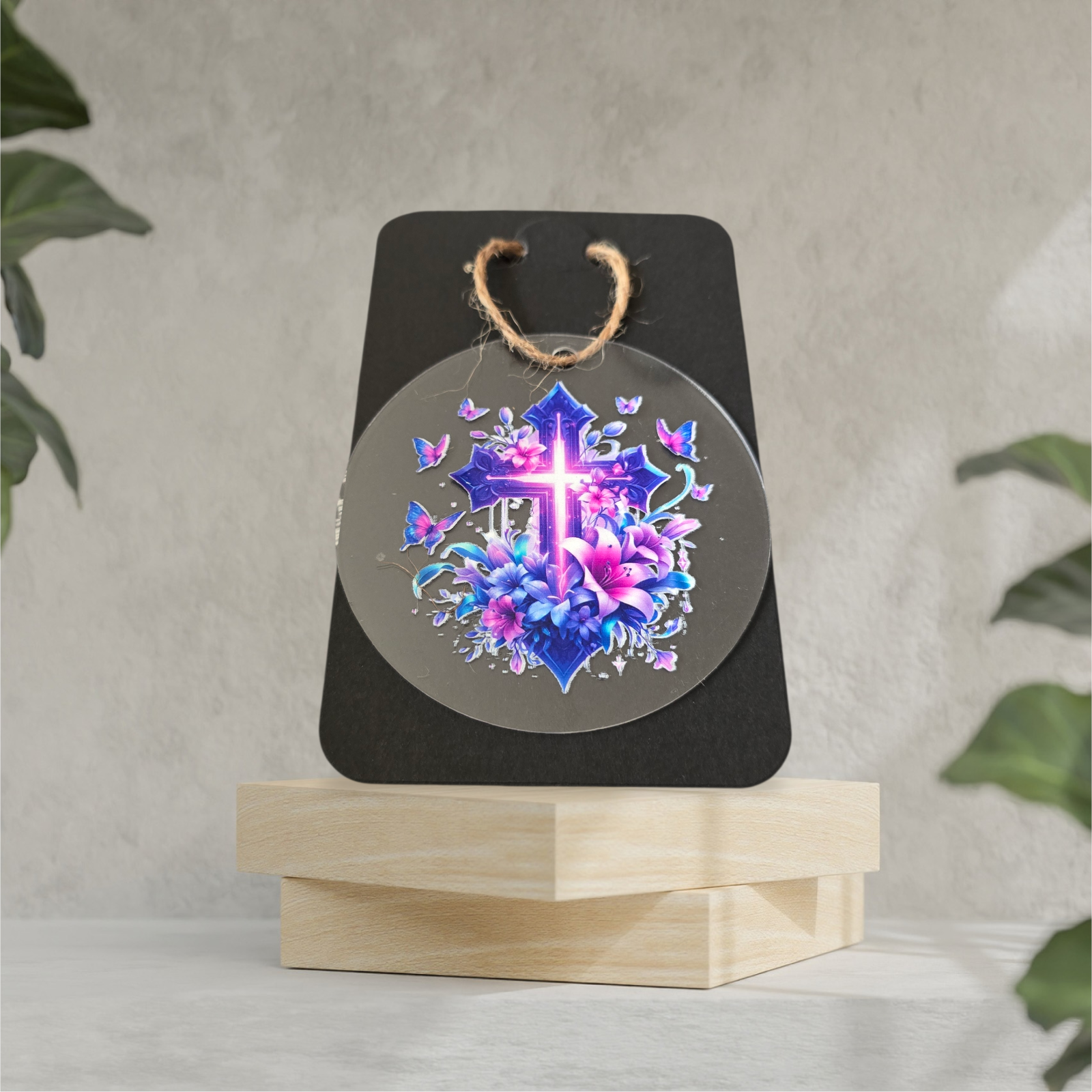 Diese einzigartige Dekoration vereint symbolische Tiefe mit moderner Ästhetik. Im Mittelpunkt steht ein leuchtendes Kreuz, umgeben von kunstvoll gestalteten Blumen und zarten Schmetterlingen in harmonischen Blau- und Violetttönen. Das Design strahlt Ruhe, Hoffnung und Inspiration aus und setzt zugleich einen eleganten Akzent in jedem Raum.